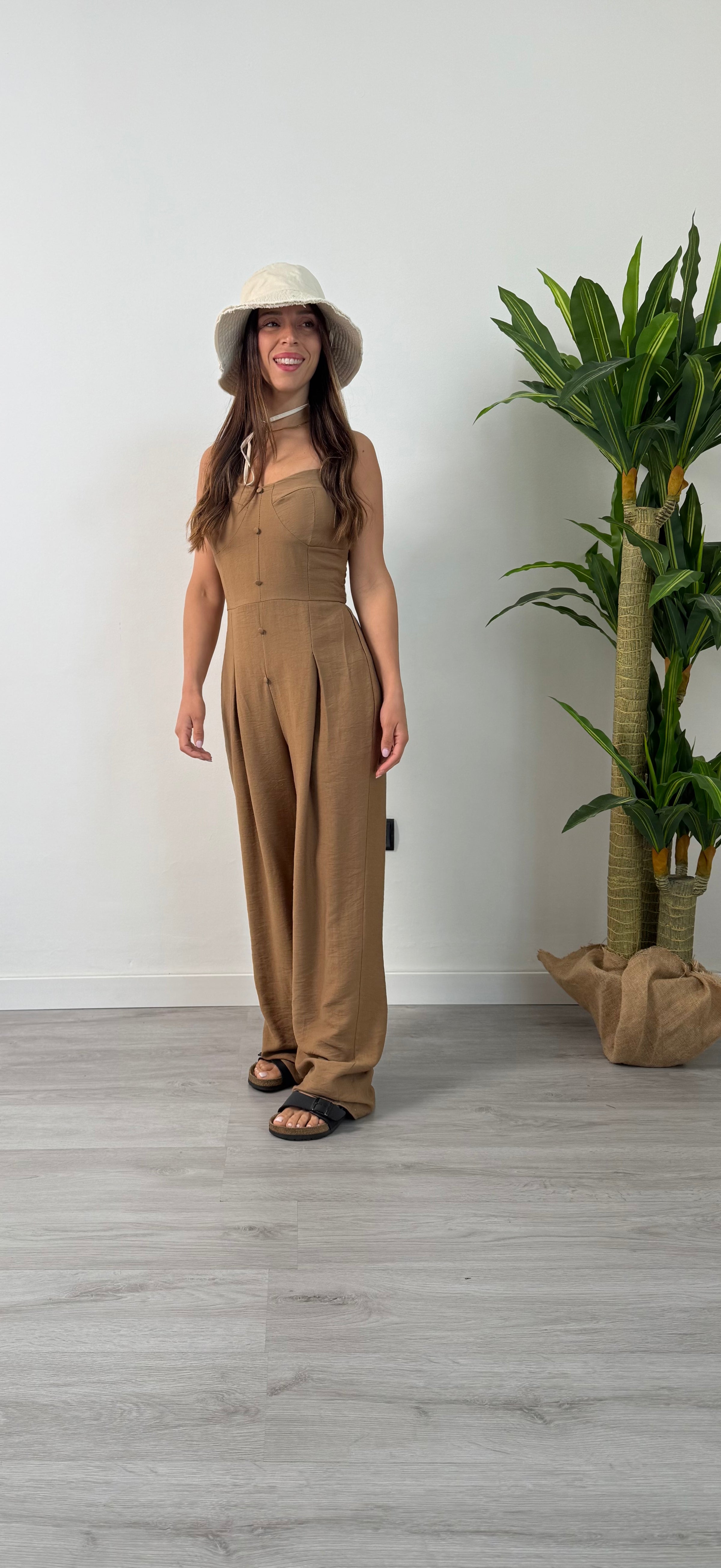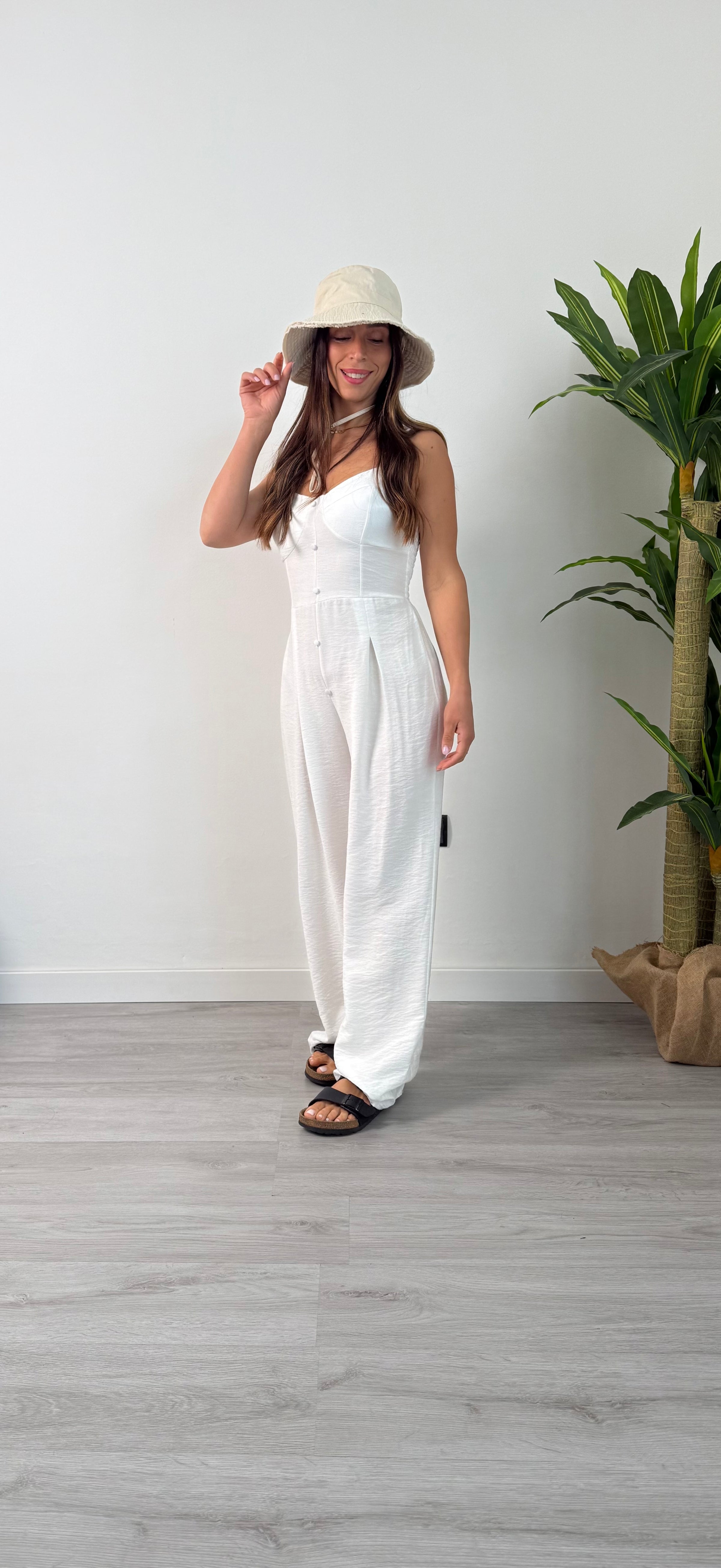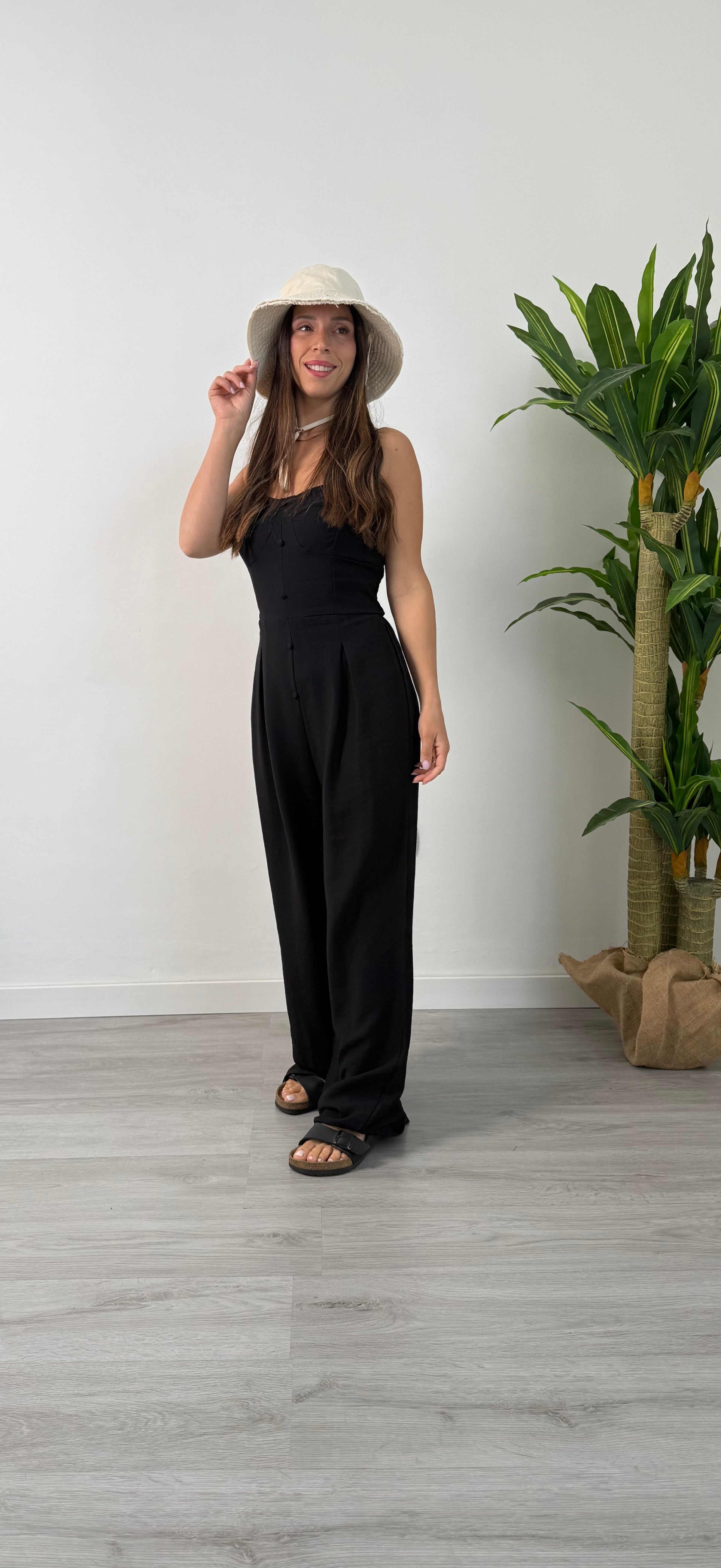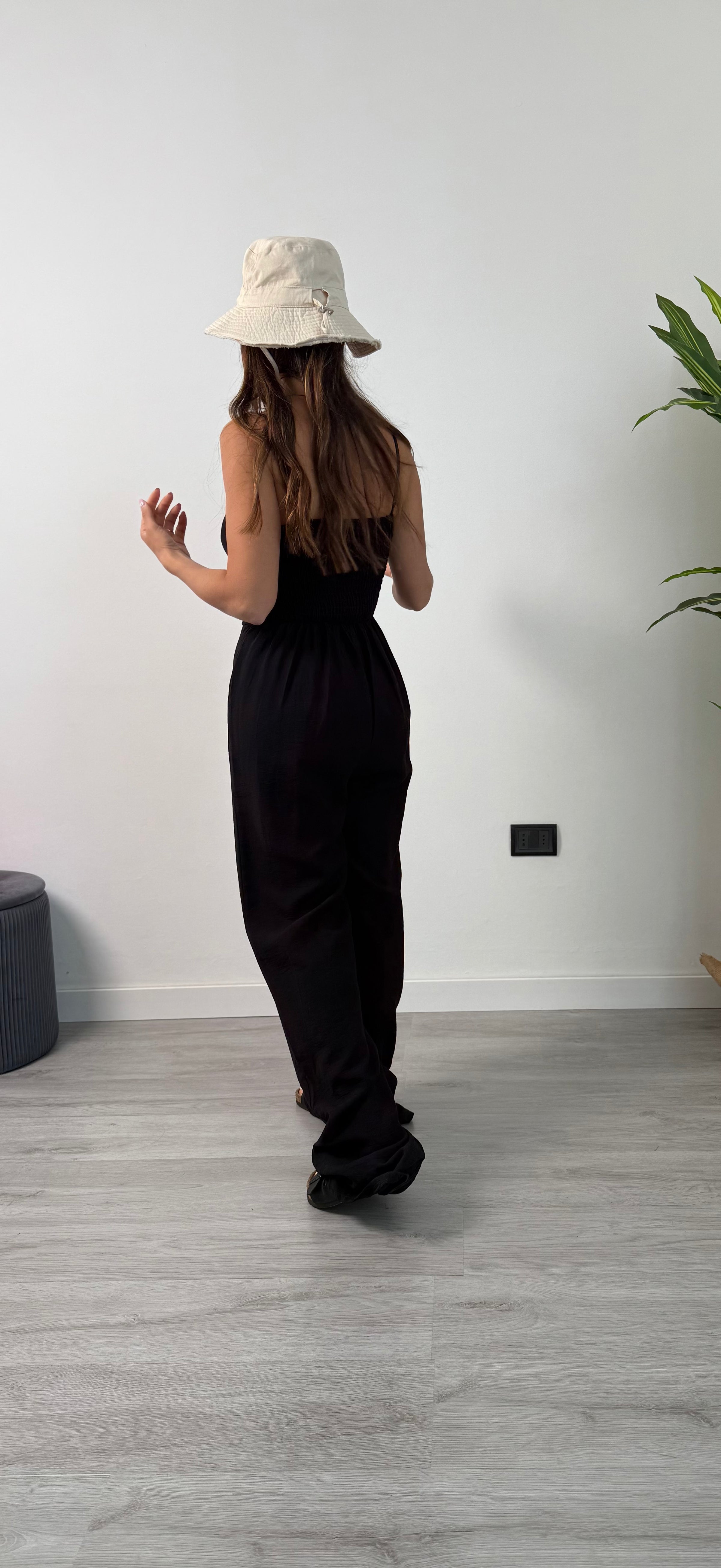 tuta intera con spalline regolabili, coppa interna, bottoni finti sul davanti, pantalone morbido. Retro con fascia elasticizzata