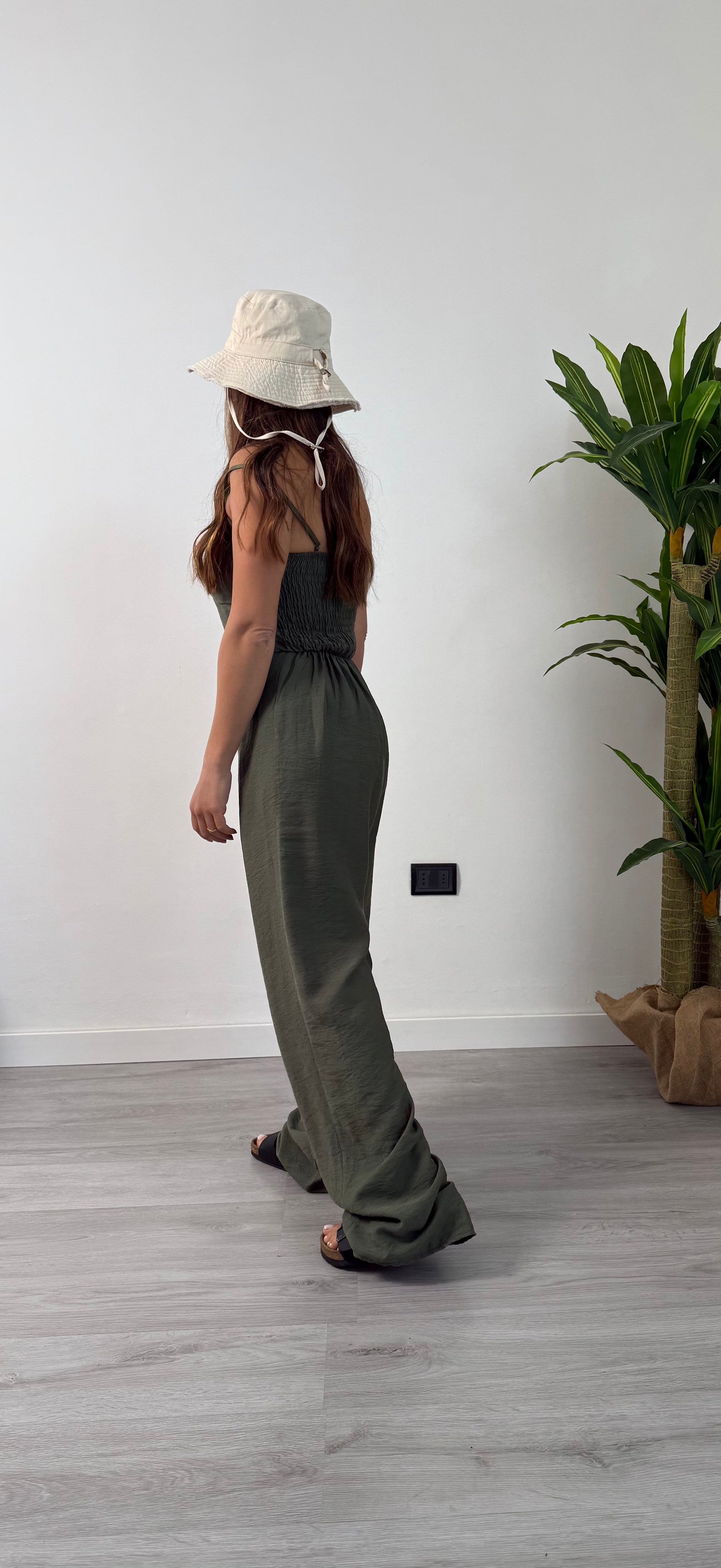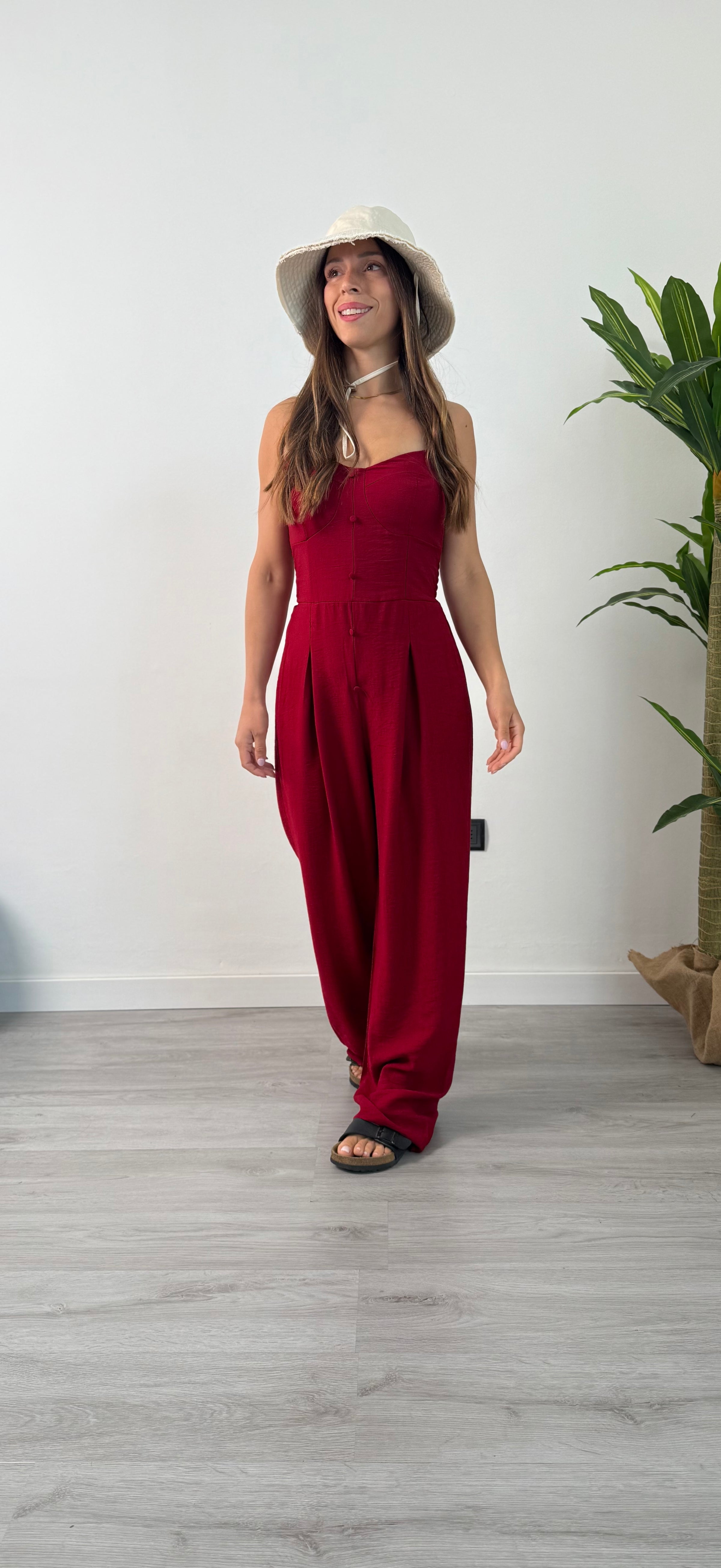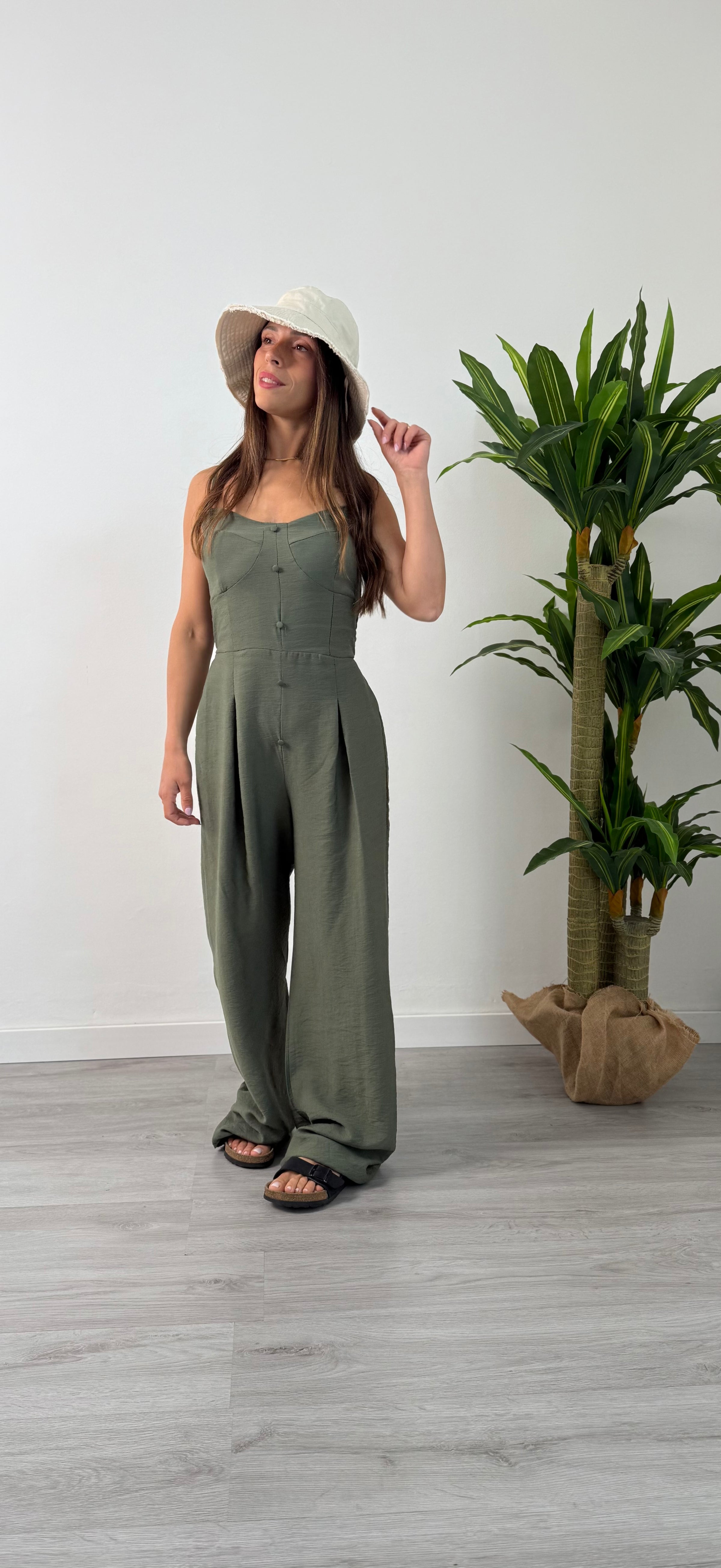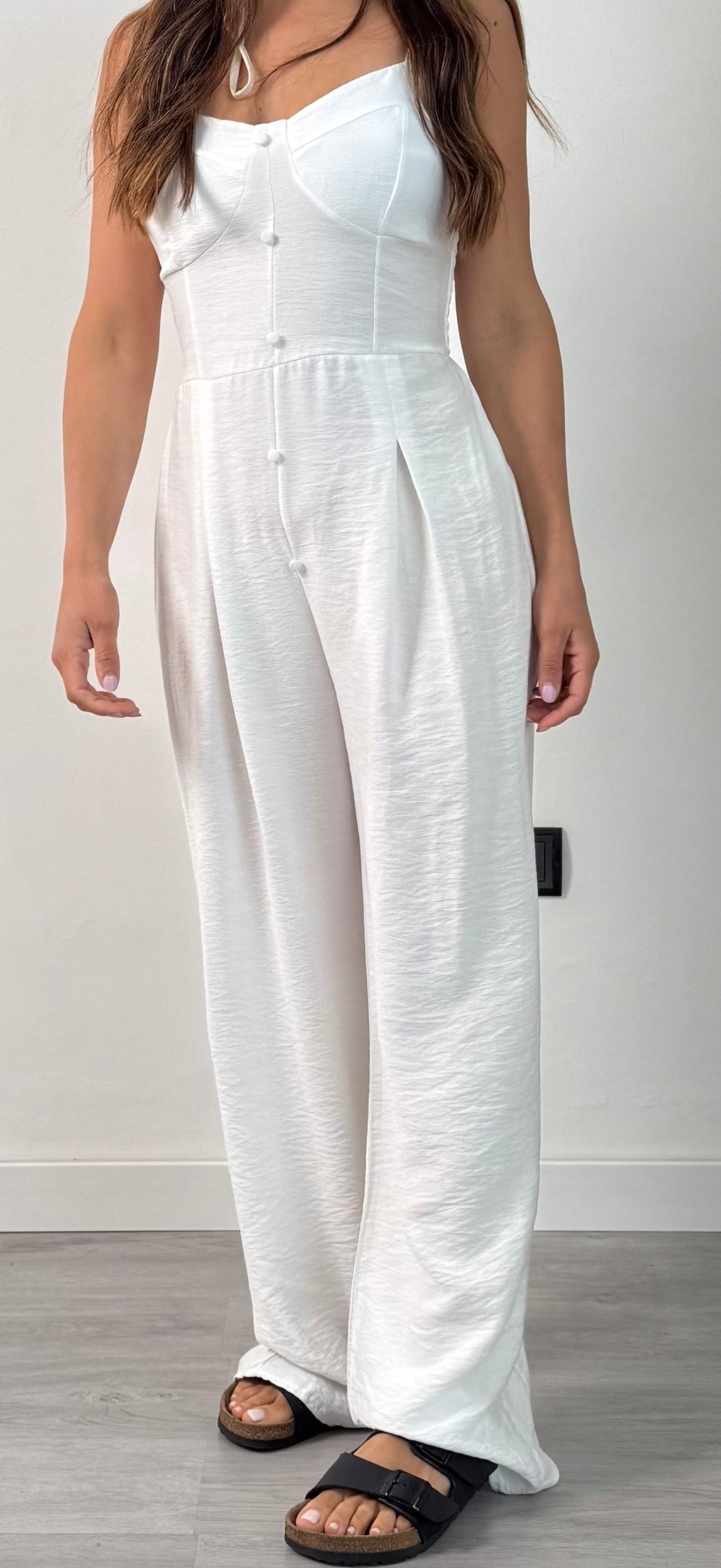 tuta intera con spalline regolabili, coppa interna, bottoni finti sul davanti, pantalone morbido. Retro con fascia elasticizzata