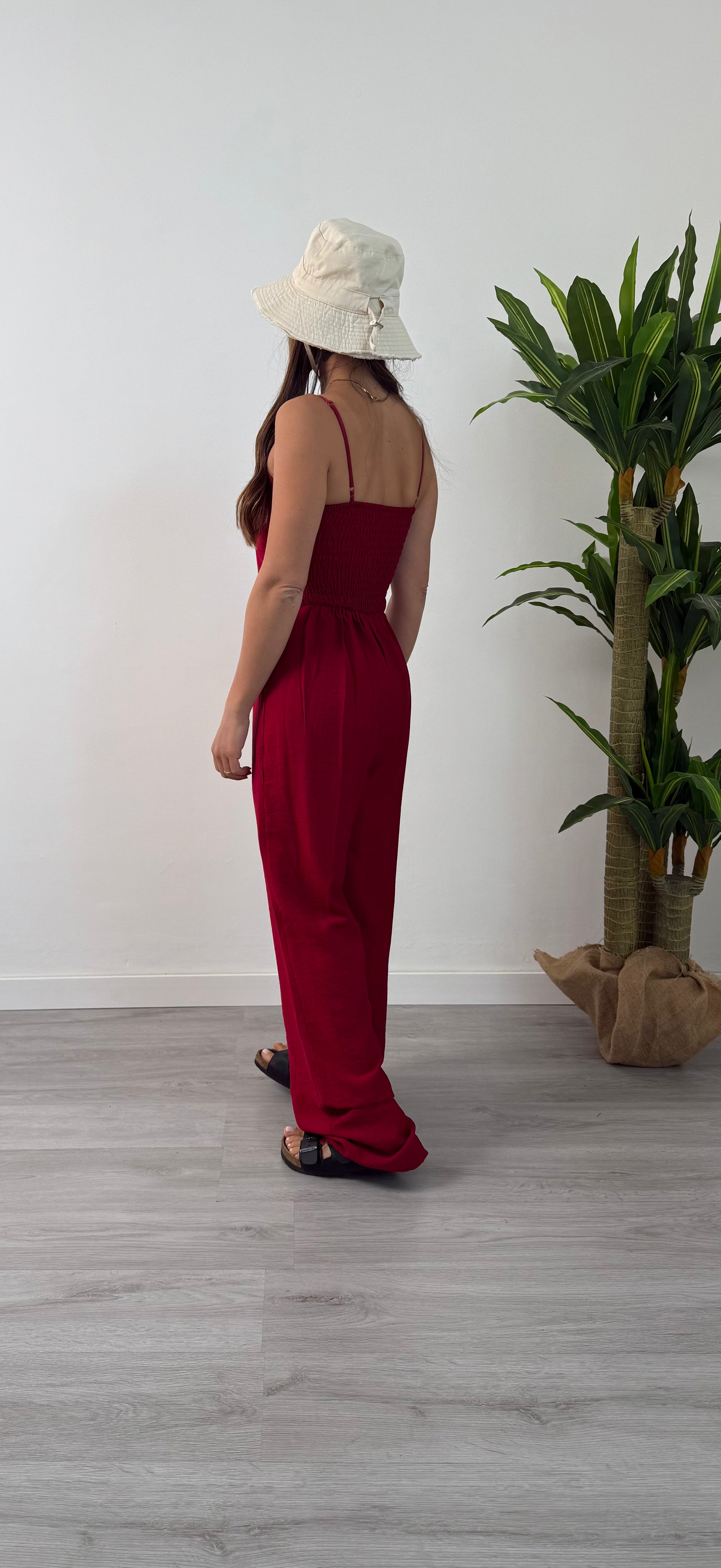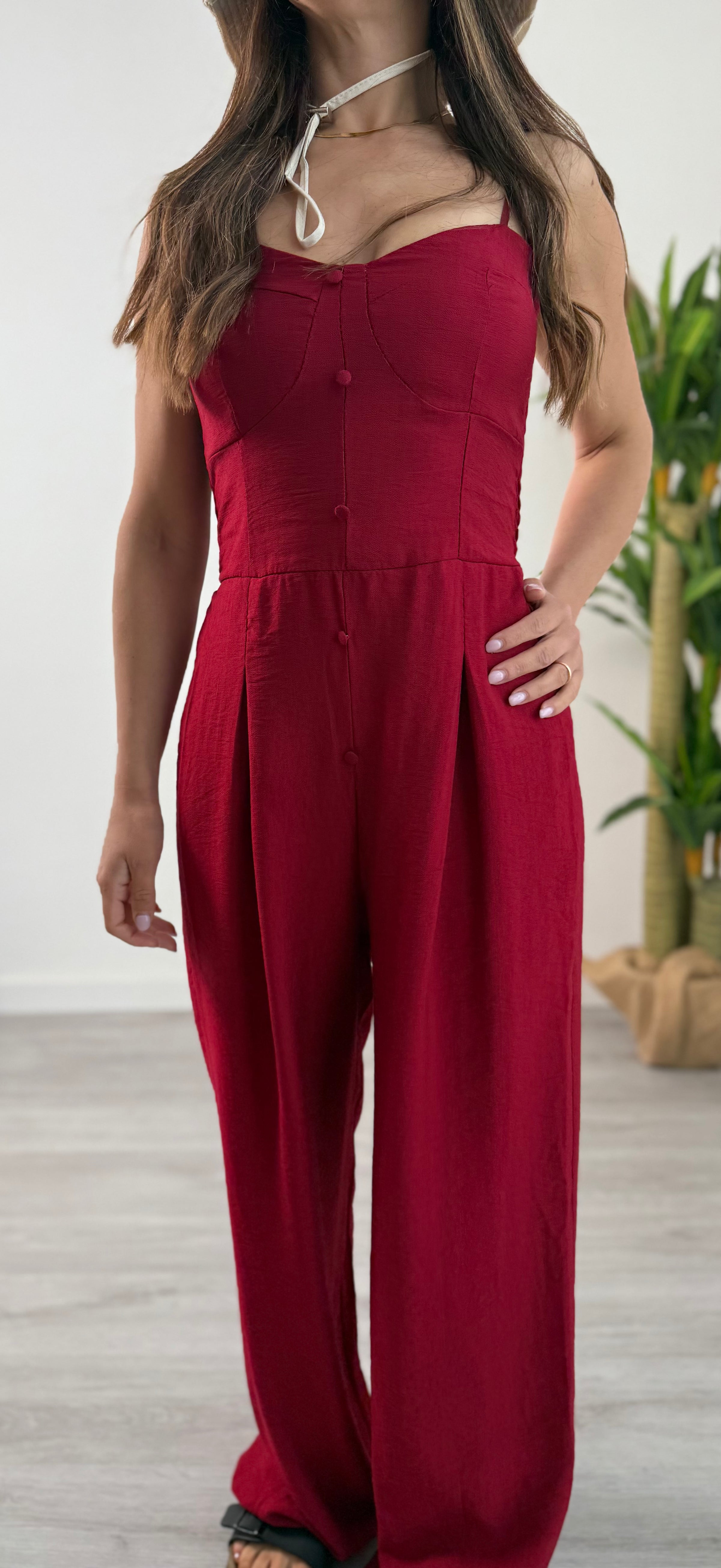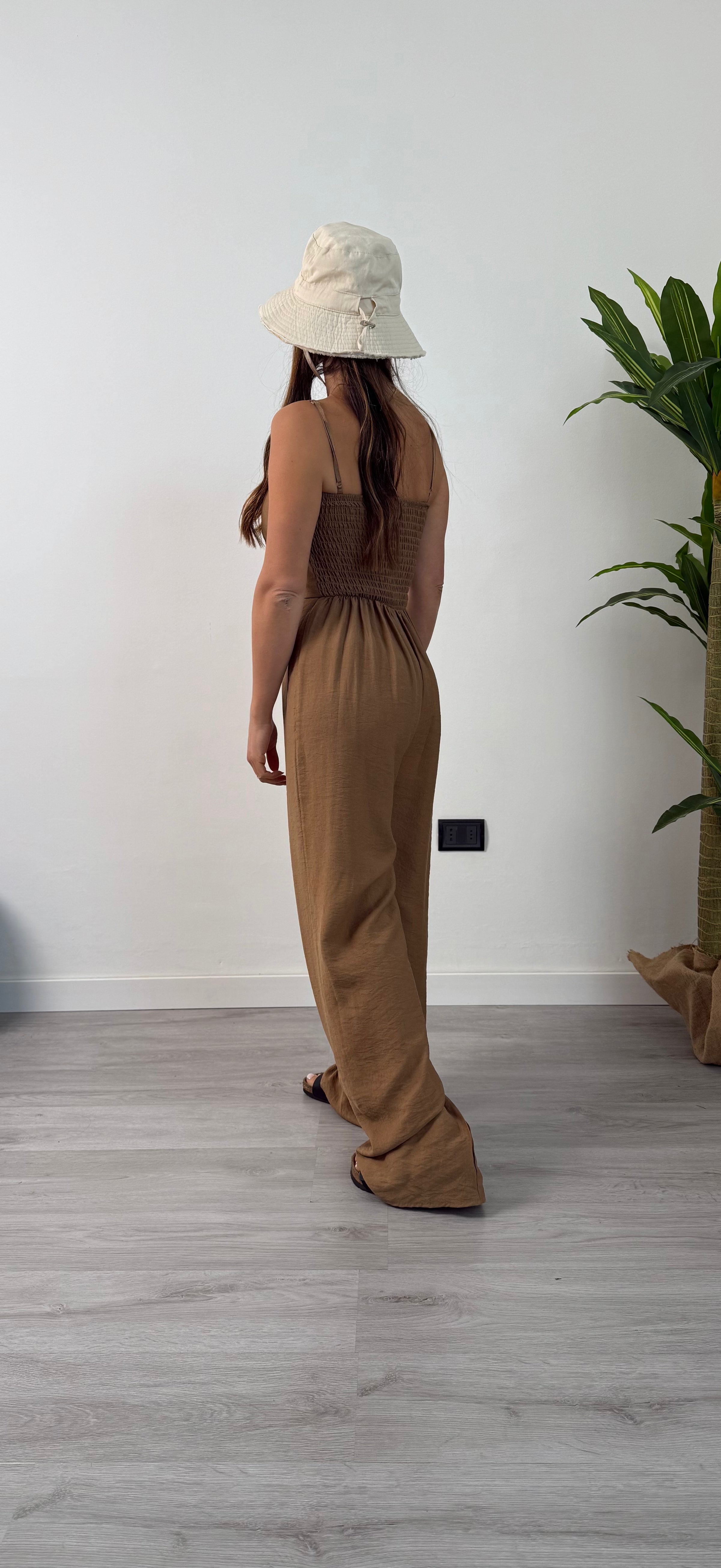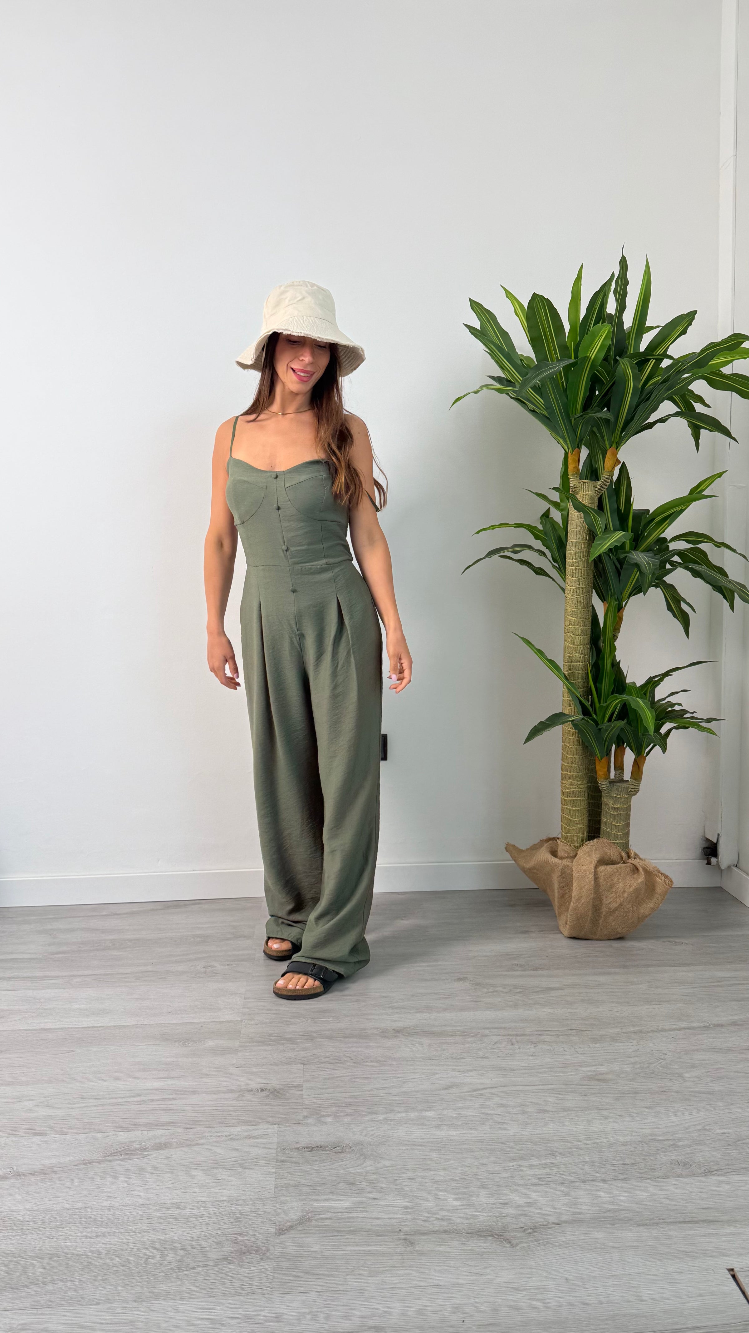 tuta intera con spalline regolabili, coppa interna, bottoni finti sul davanti, pantalone morbido. Retro con fascia elasticizzata