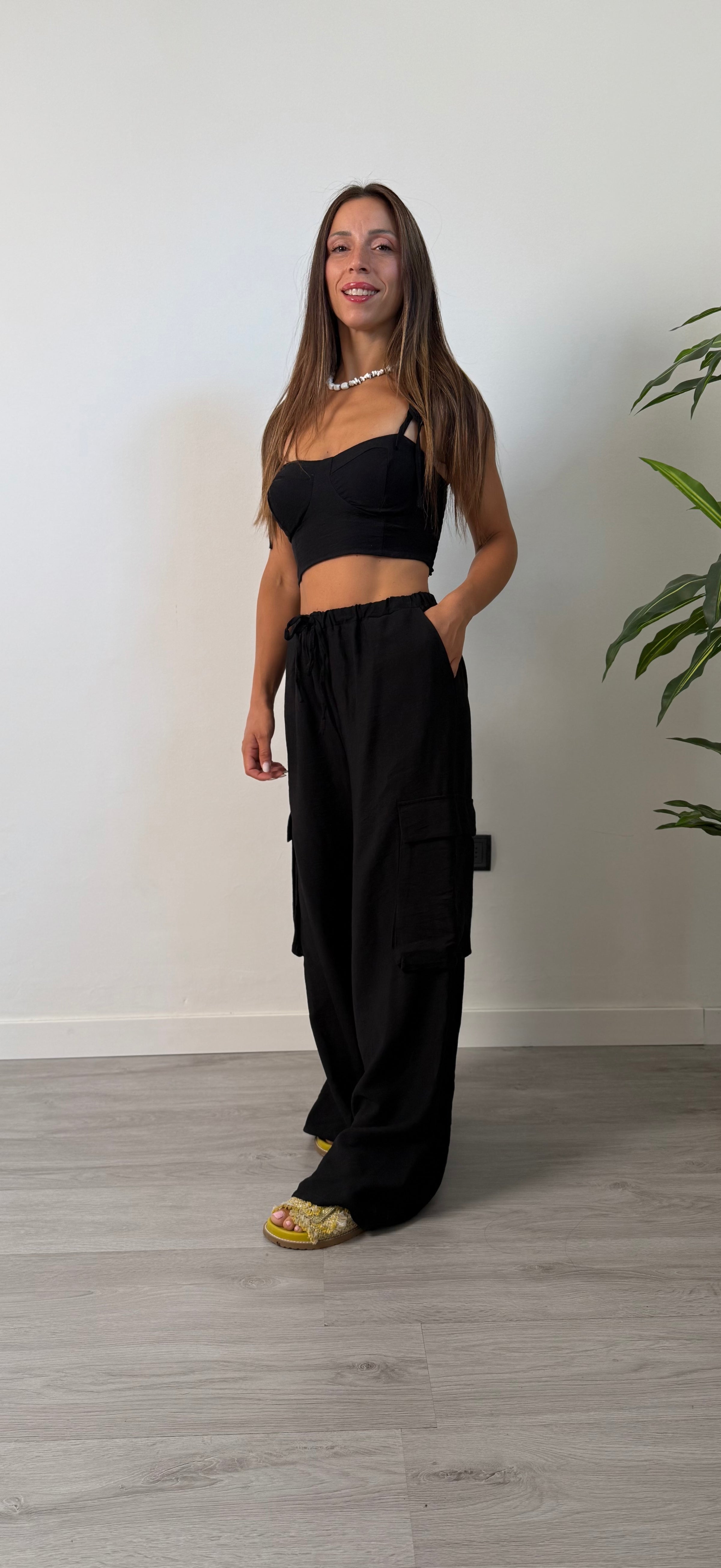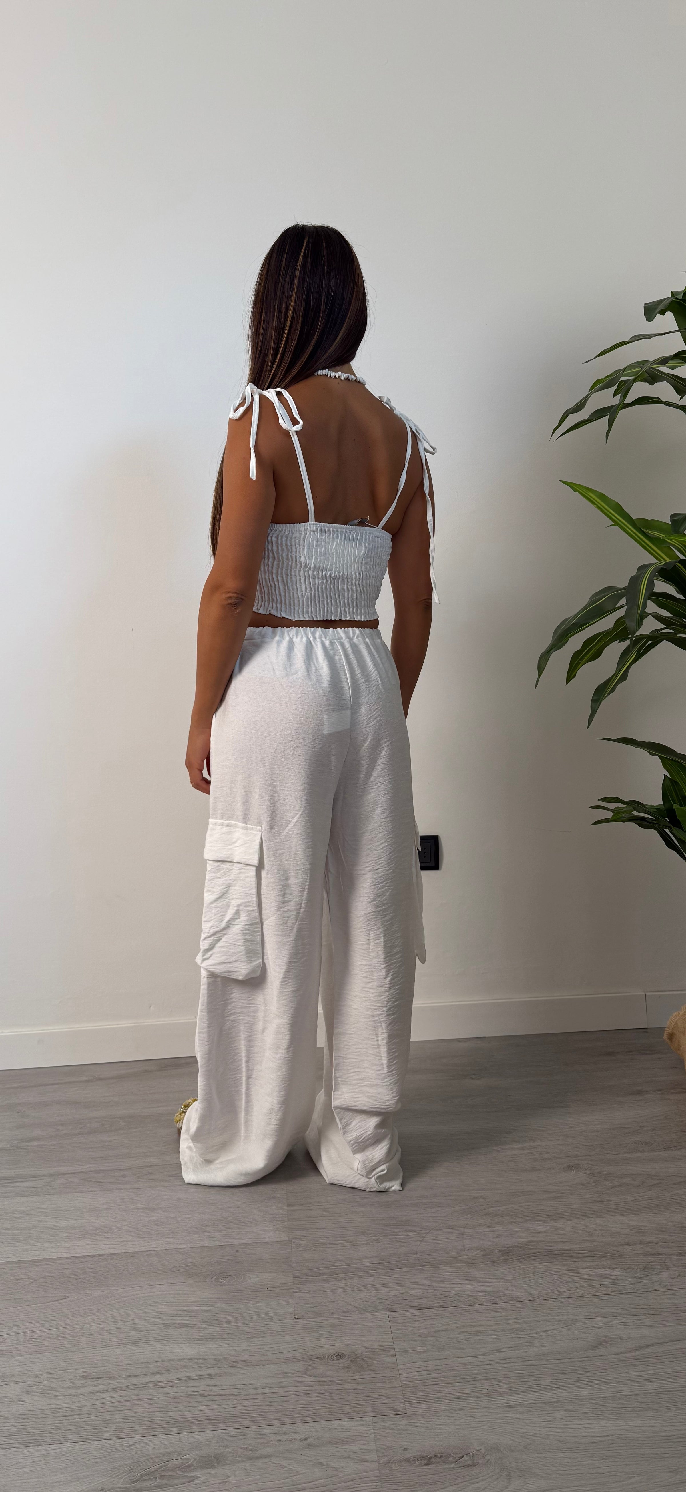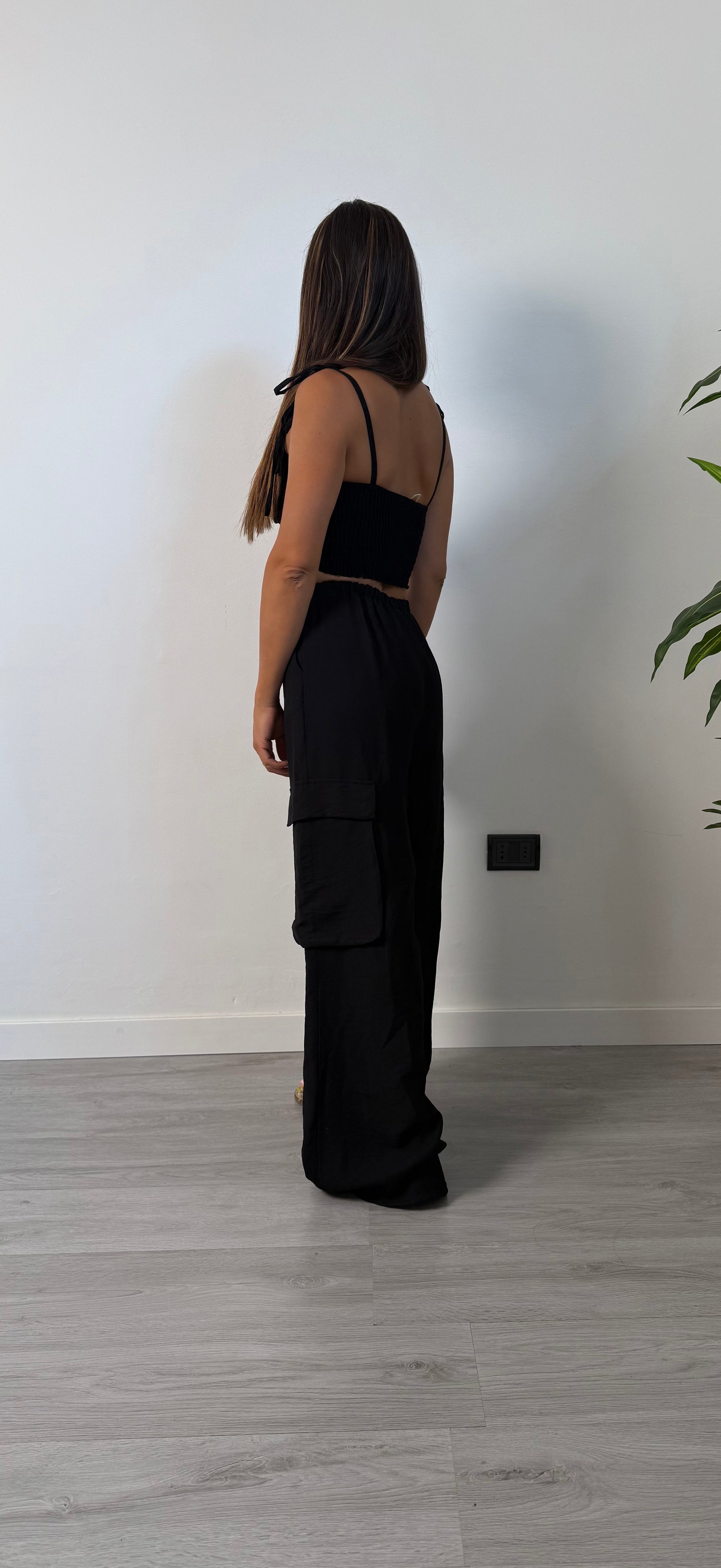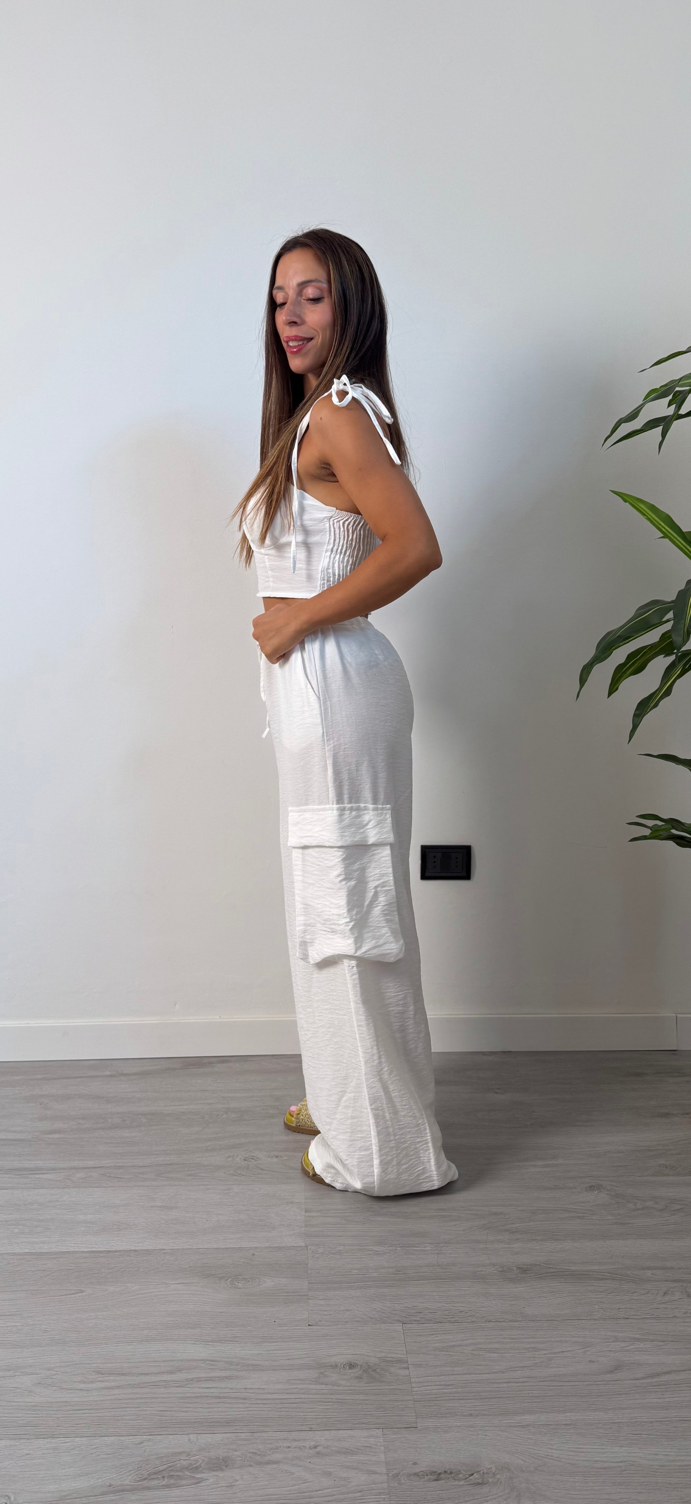 Coordinato due pezzi, top elasticizzato sul retro con coppe preformate, spalline regolabili con ciocco. Pantalone cargo morbido a palazzo molla in vita elasticizzato  con tasconi ai lati, tasche laterali. Consigliato fino ad una tg 44/46