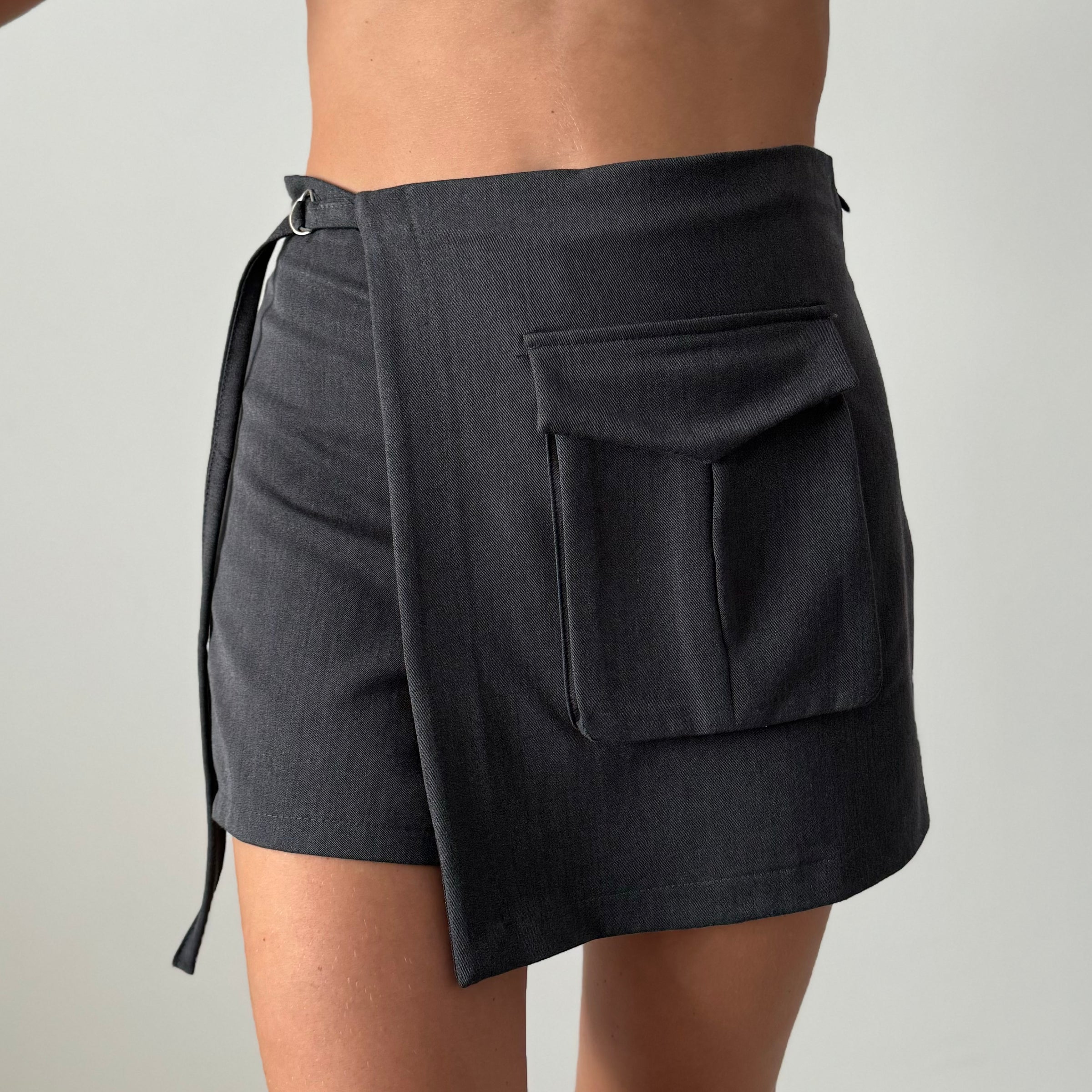Gonna pantalone con tasca, asimmetrico e cinturino laterale