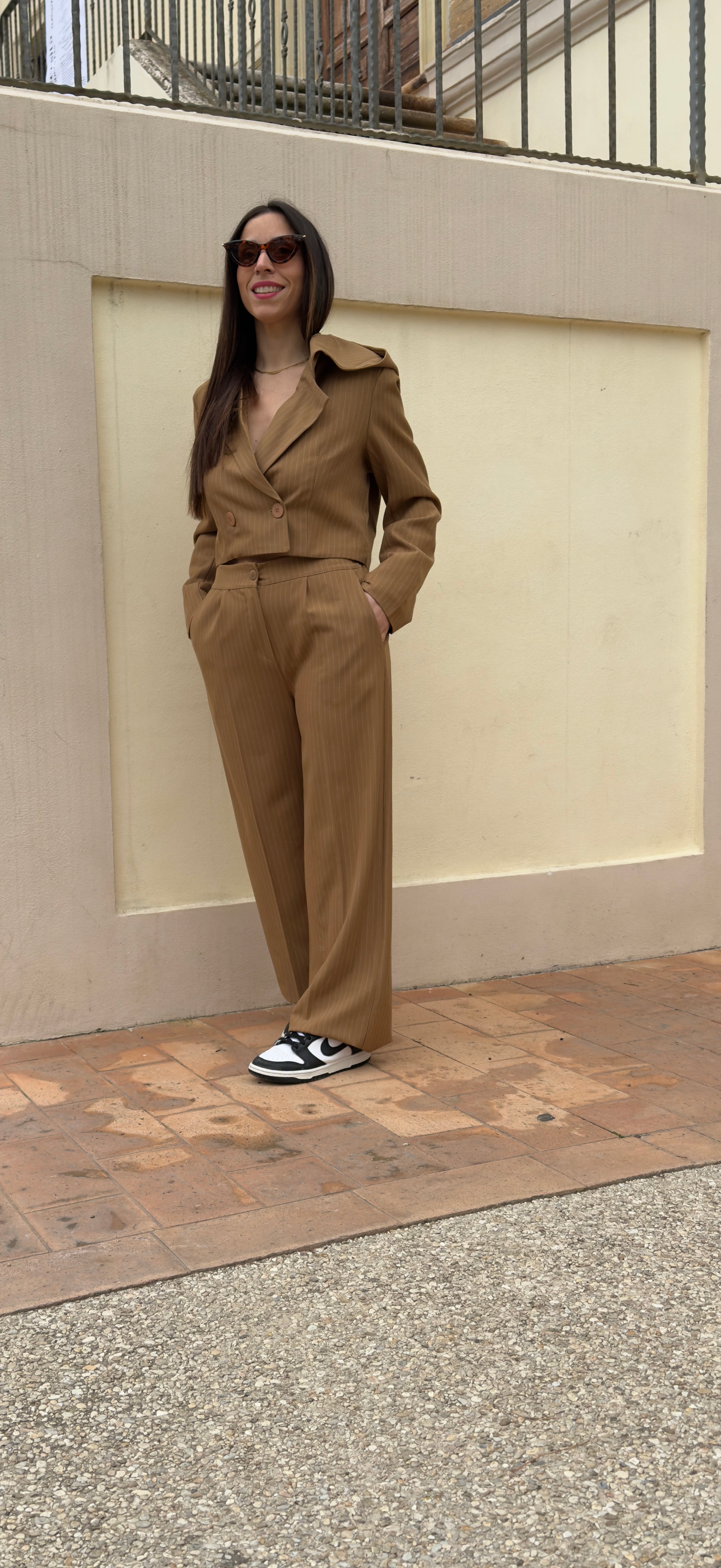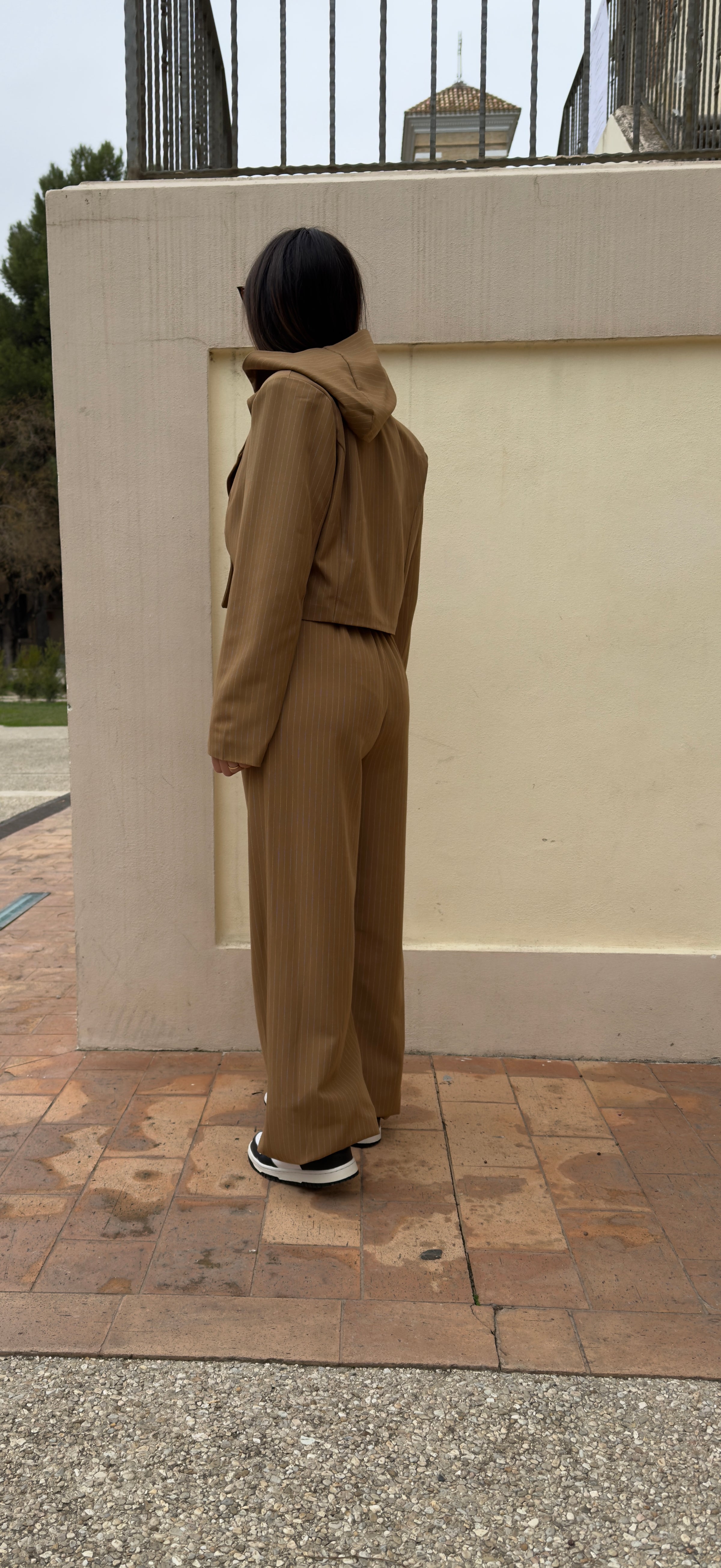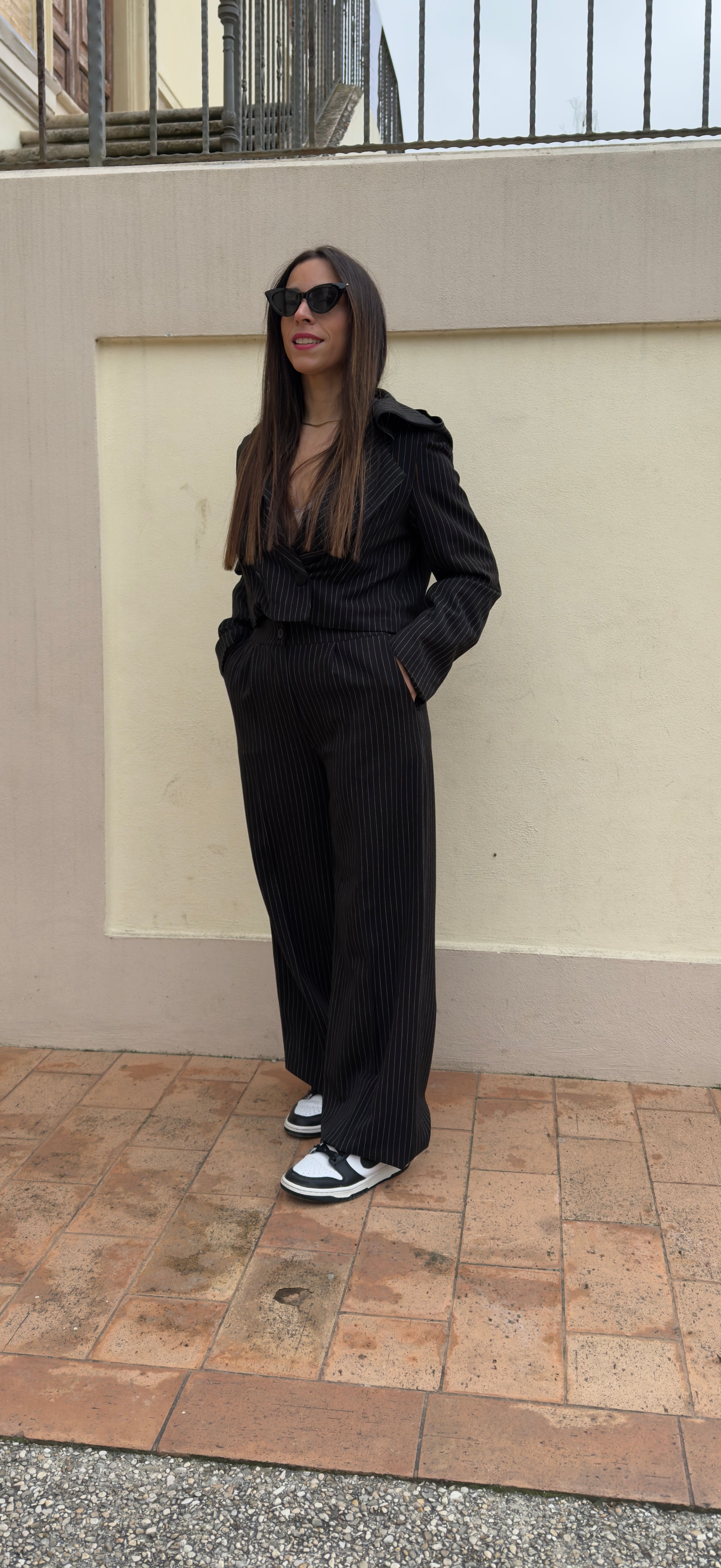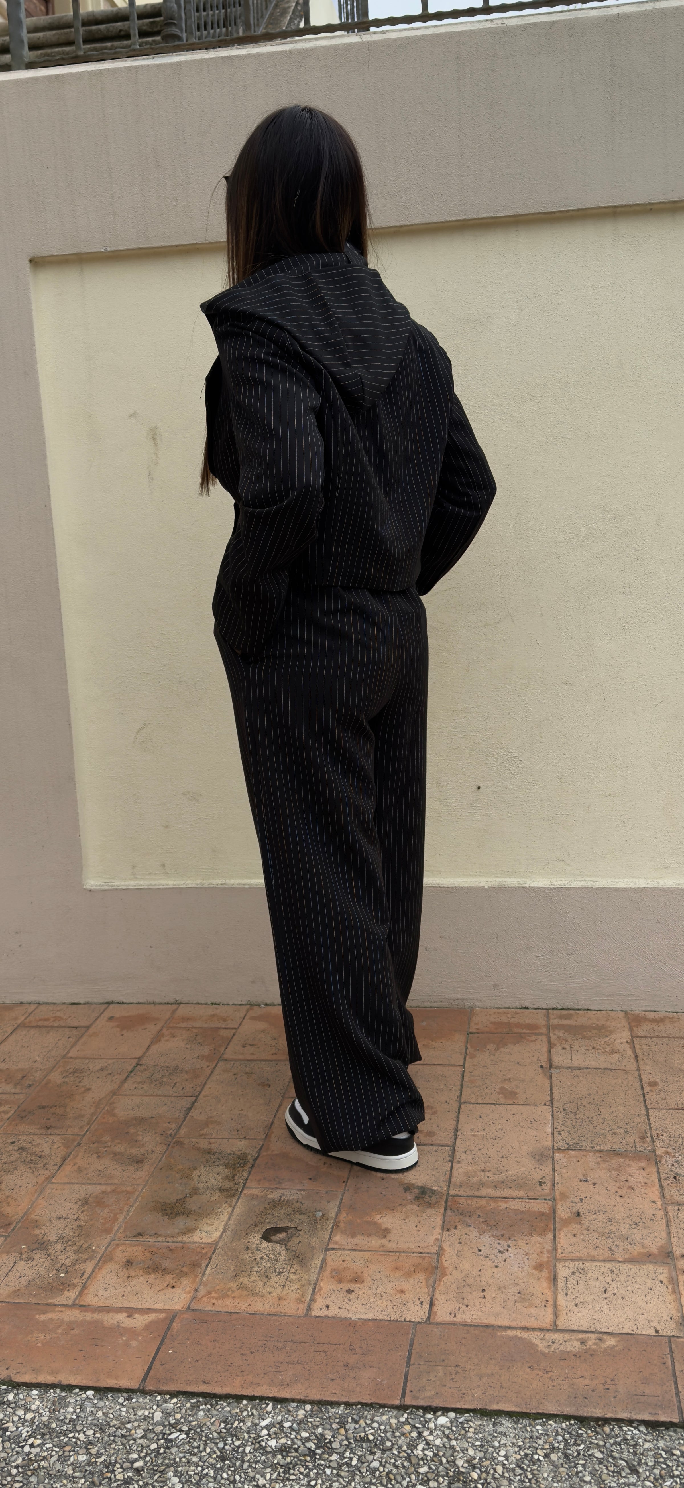 Completo gessato composto da pantalone a palazzo molto lungo con molla in vita e bottone. Blazer modello crop con scollo a V abbottonatura doppio petto e cappuccio