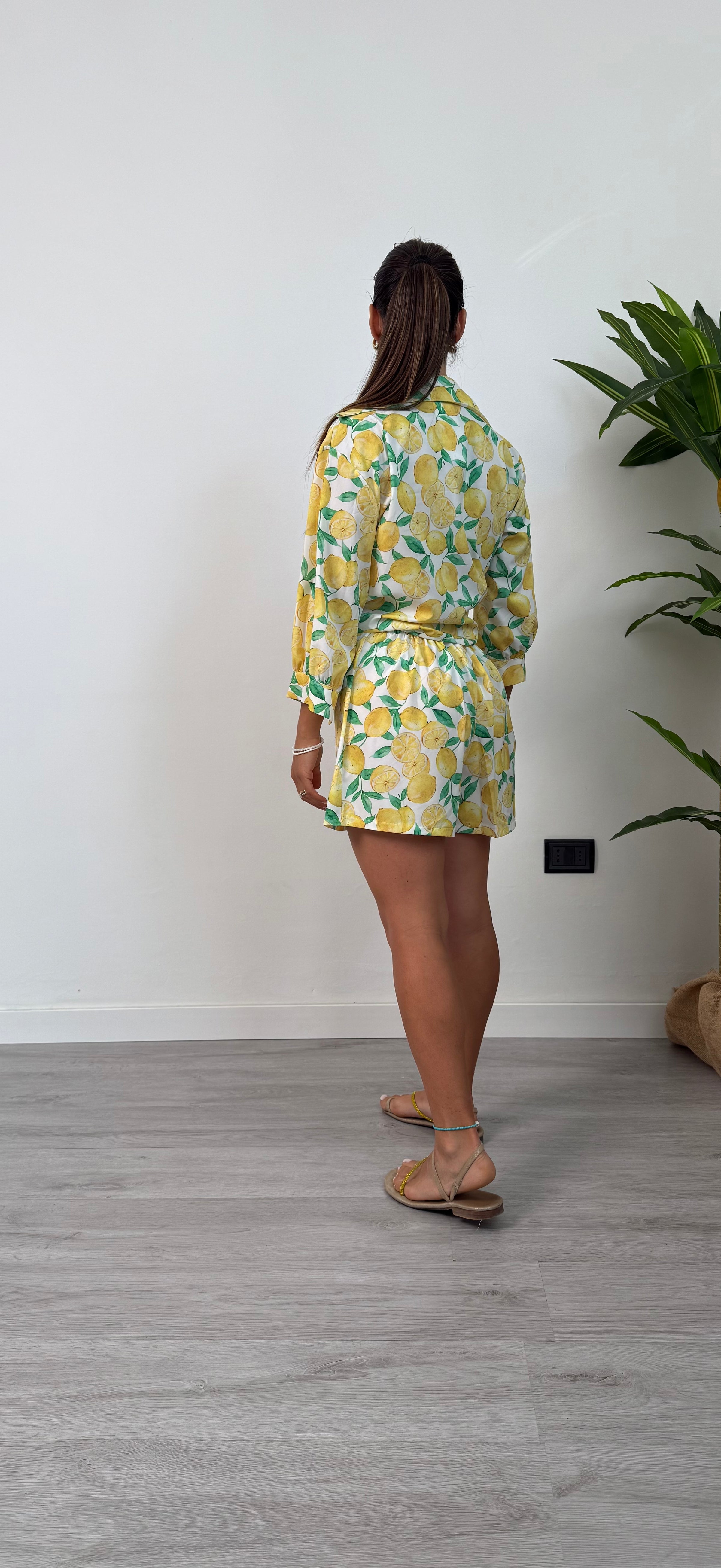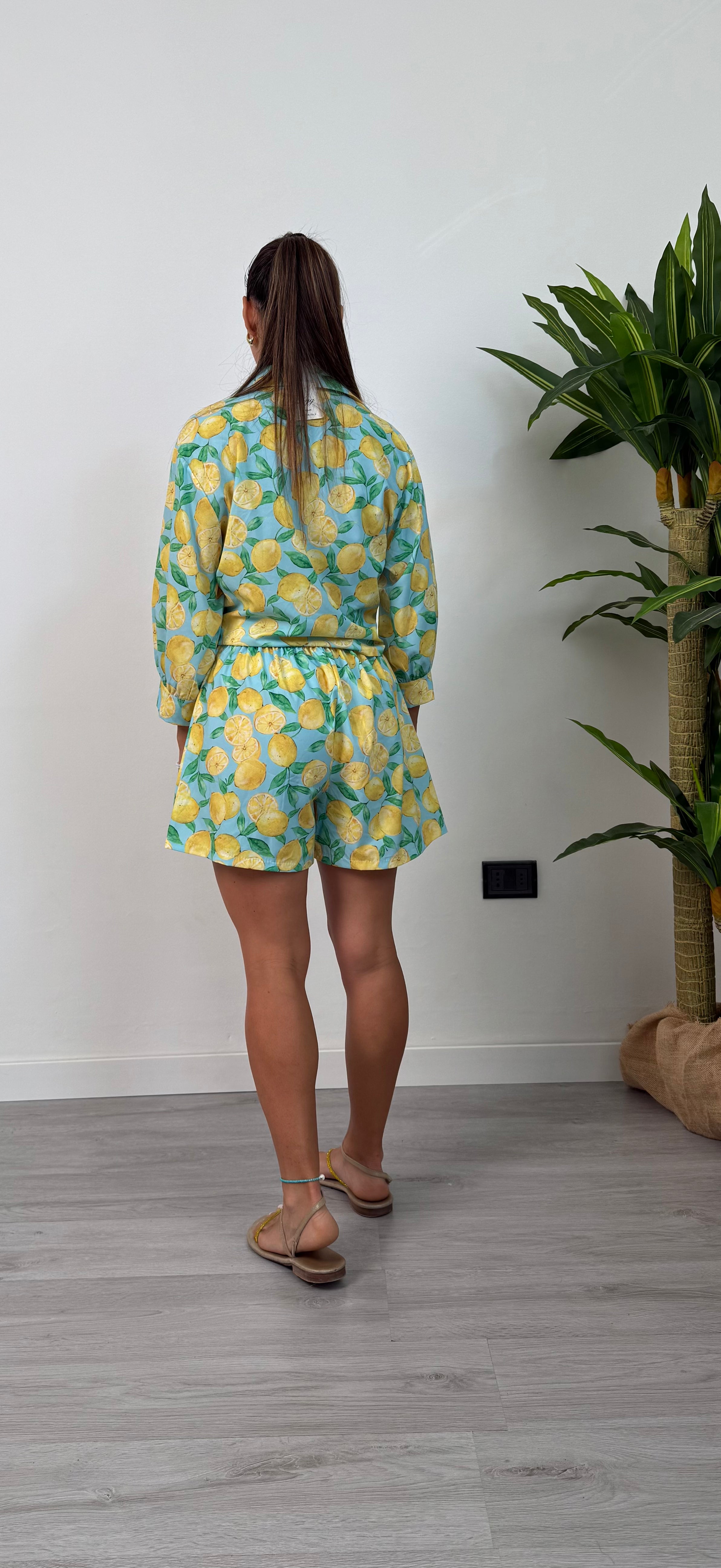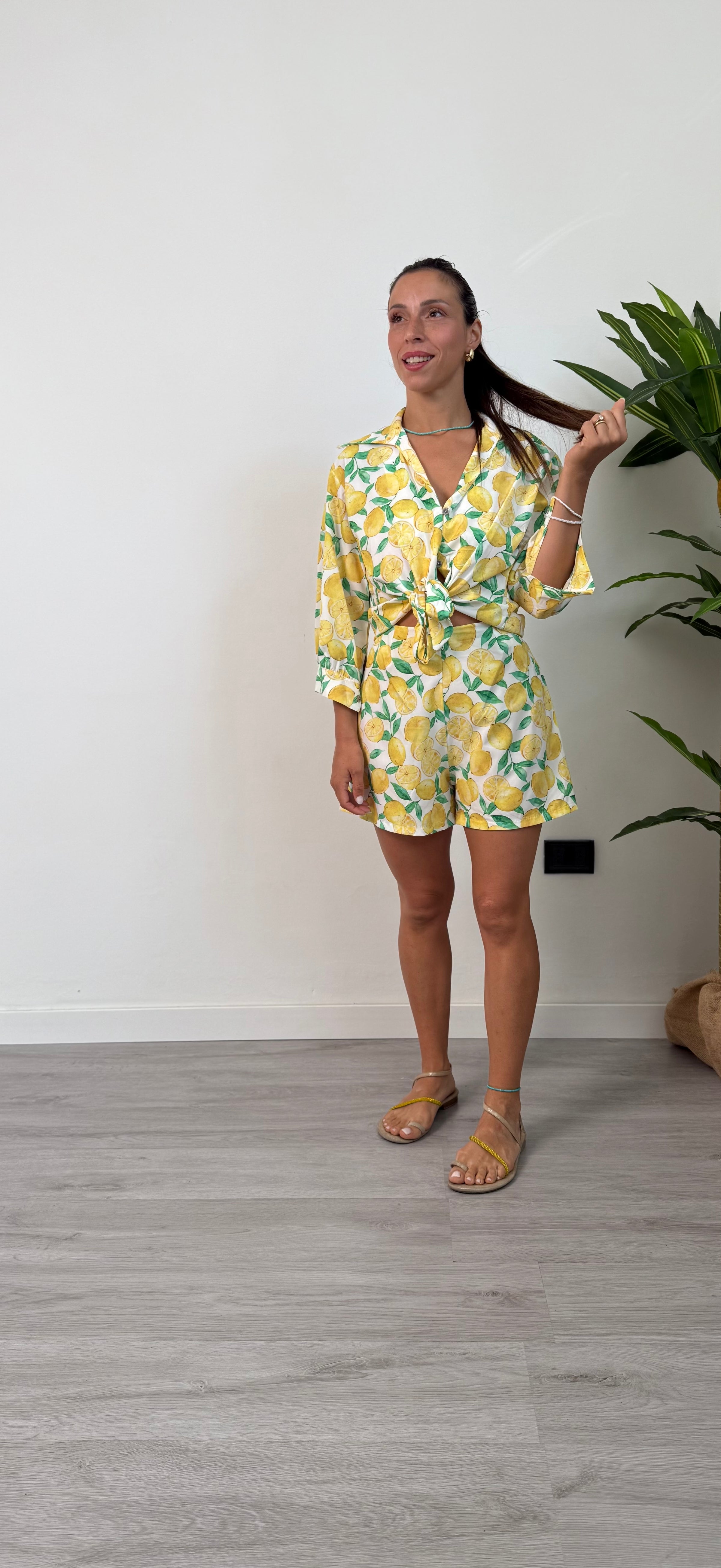 Coordinato due pezzi elasticizzato, camicia con bottoni e nodo sul davanti, maniche leggermente a sbuffo , pantalone elasticizzato con molla in vita . Consigliato fino ad una tg 44/46