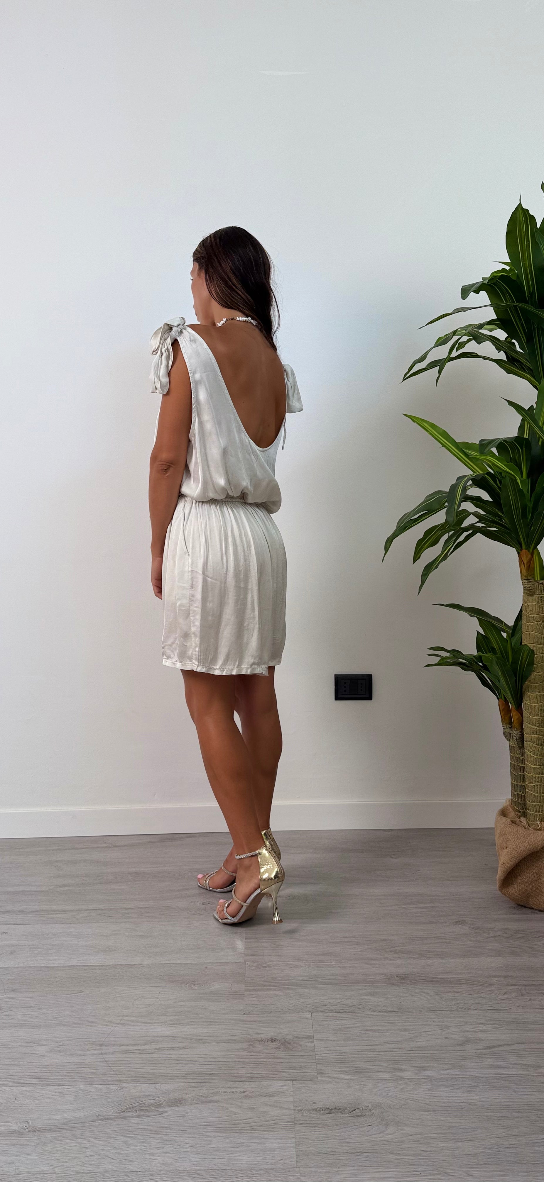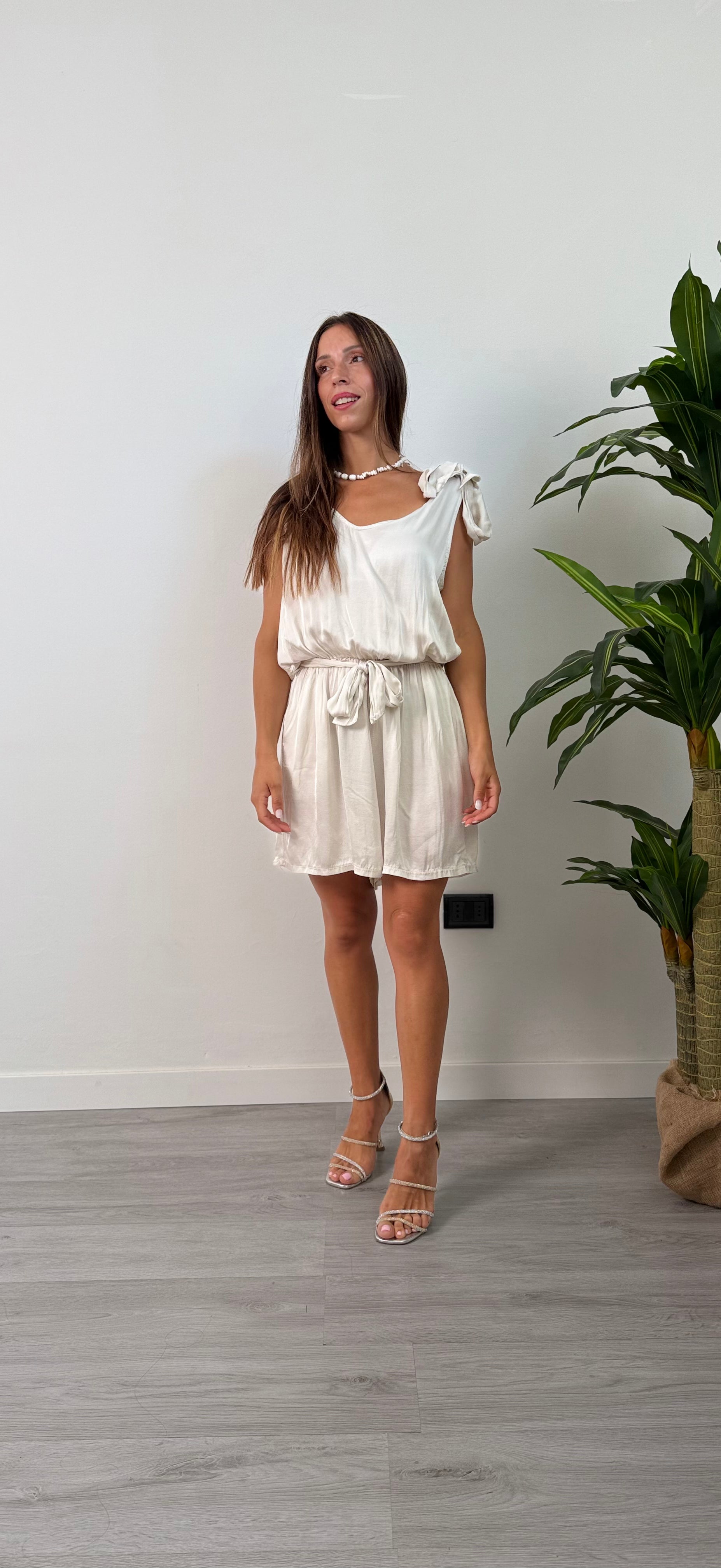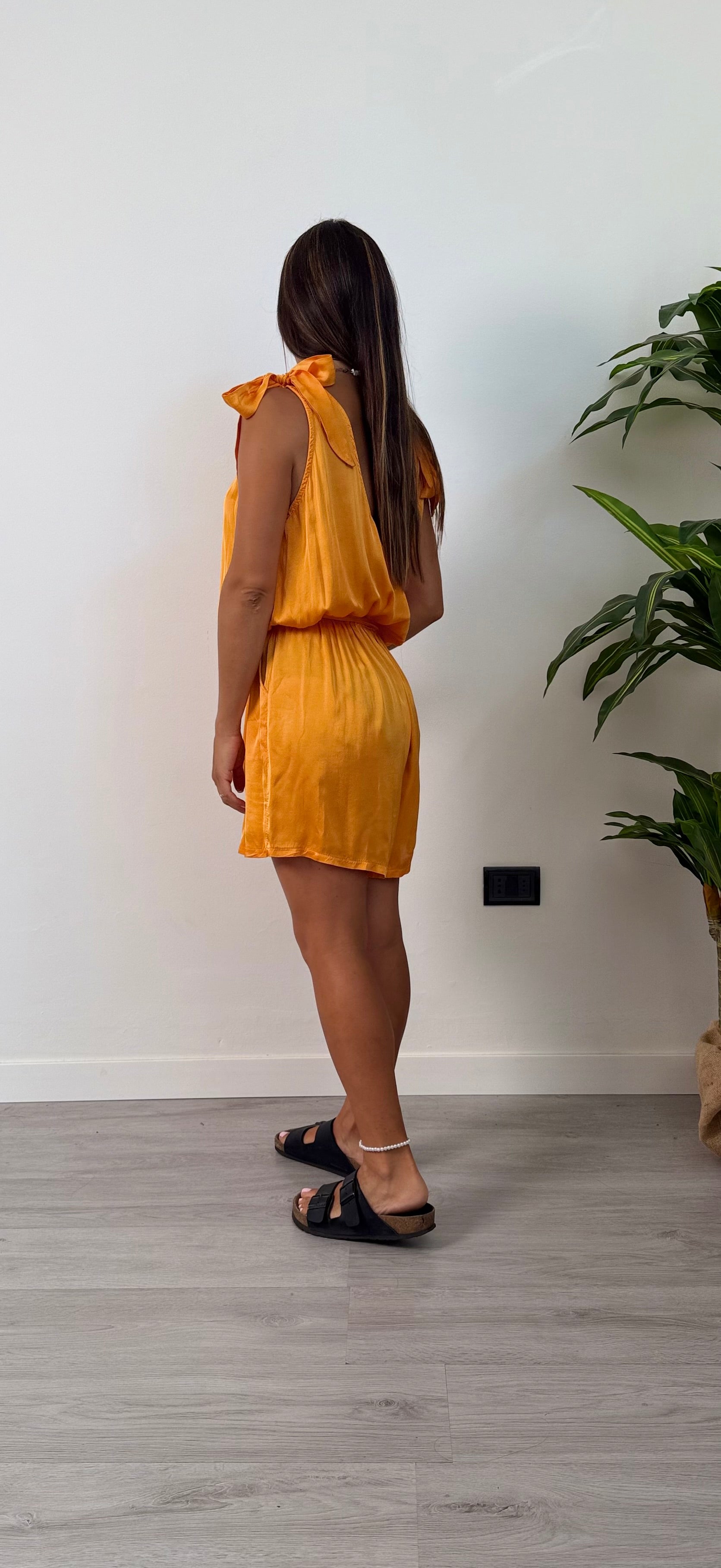 tuta intera morbida molla in vita elasticizzata, con cintura, tasche laterali, spallina con fiocco, scollatura avanti e suL retro. Consigliato fino ad una tg 46/48