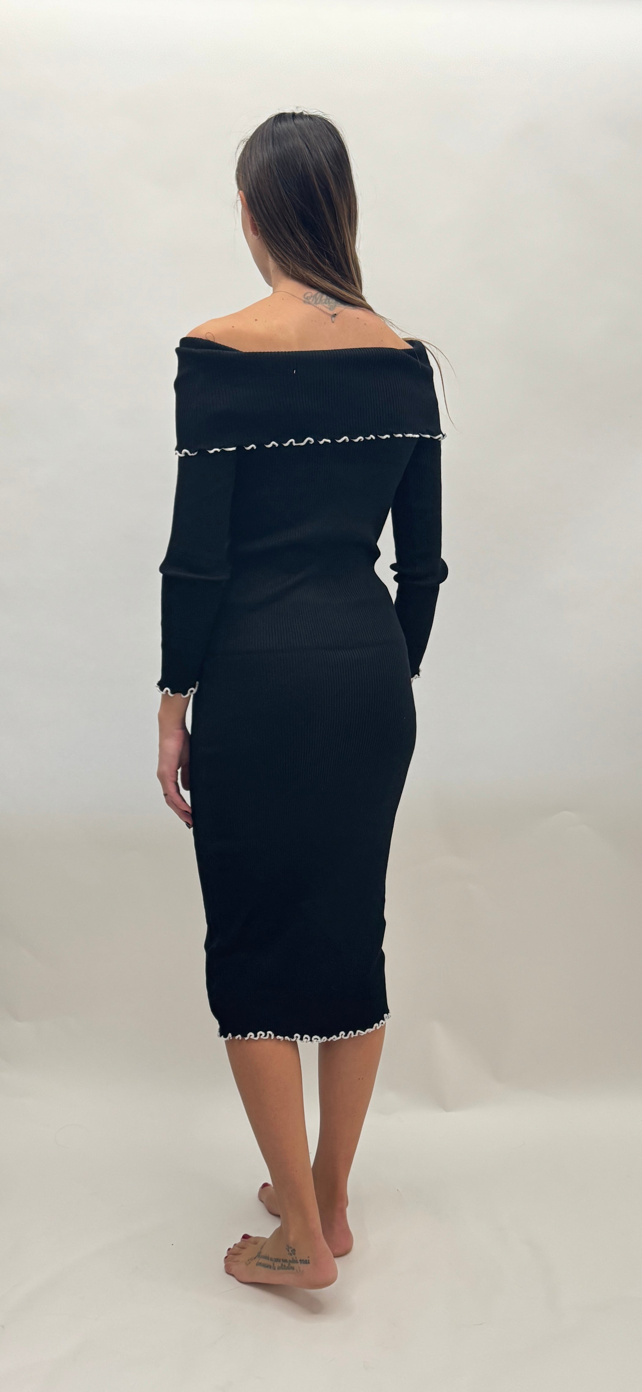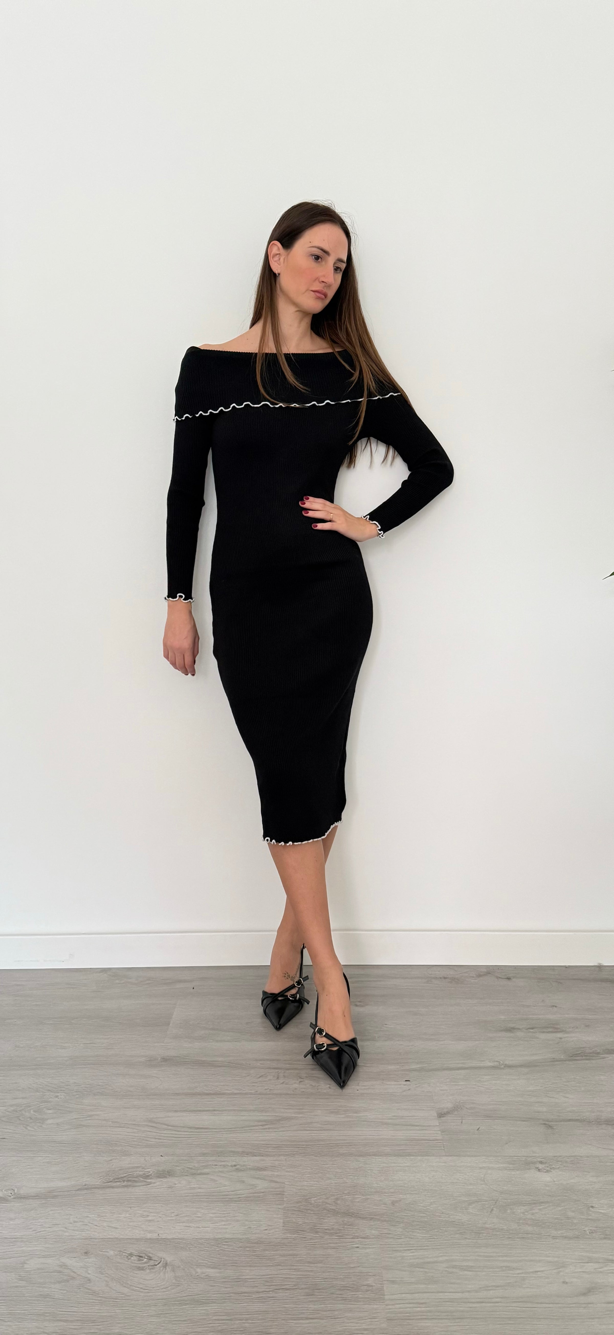 Abito aderente a costine con scollo a barca. Bordino ondulato