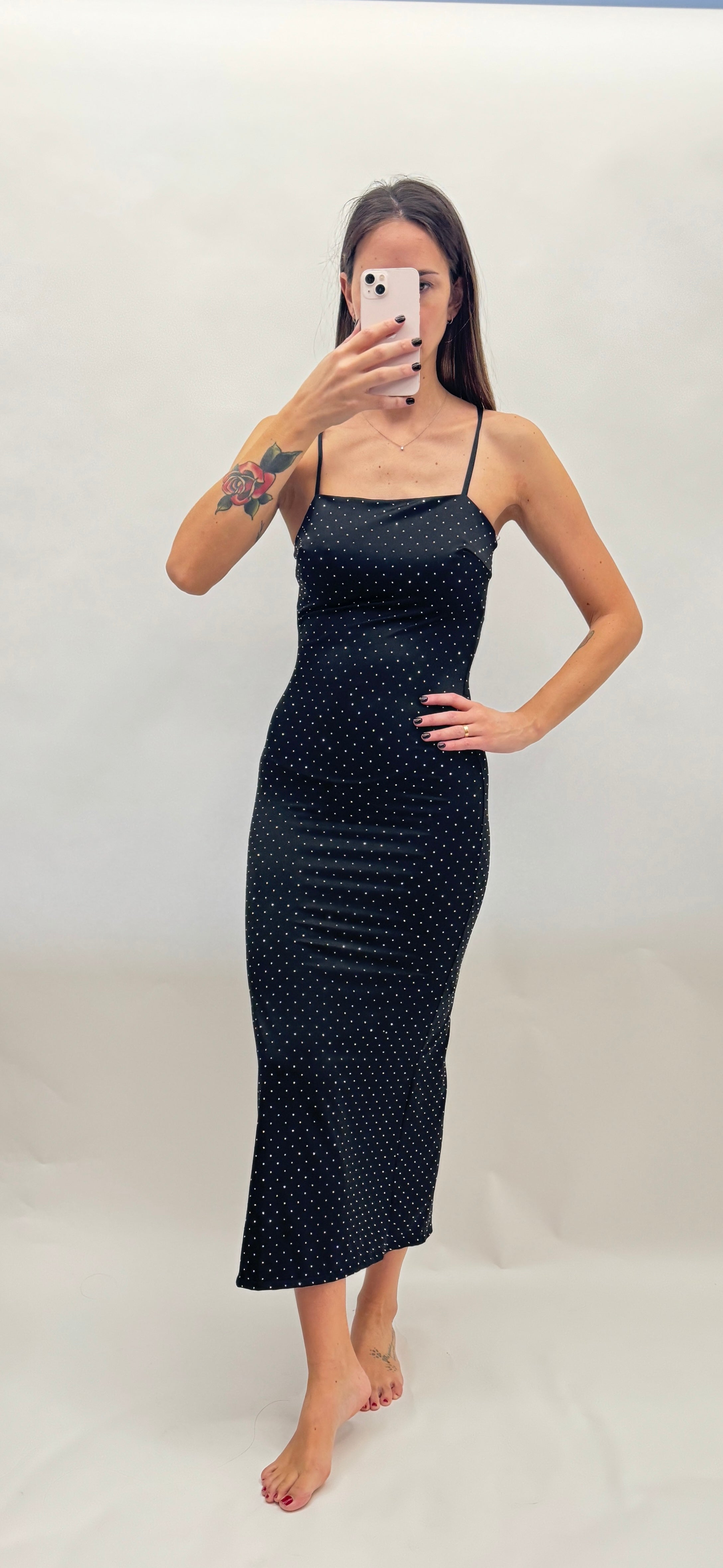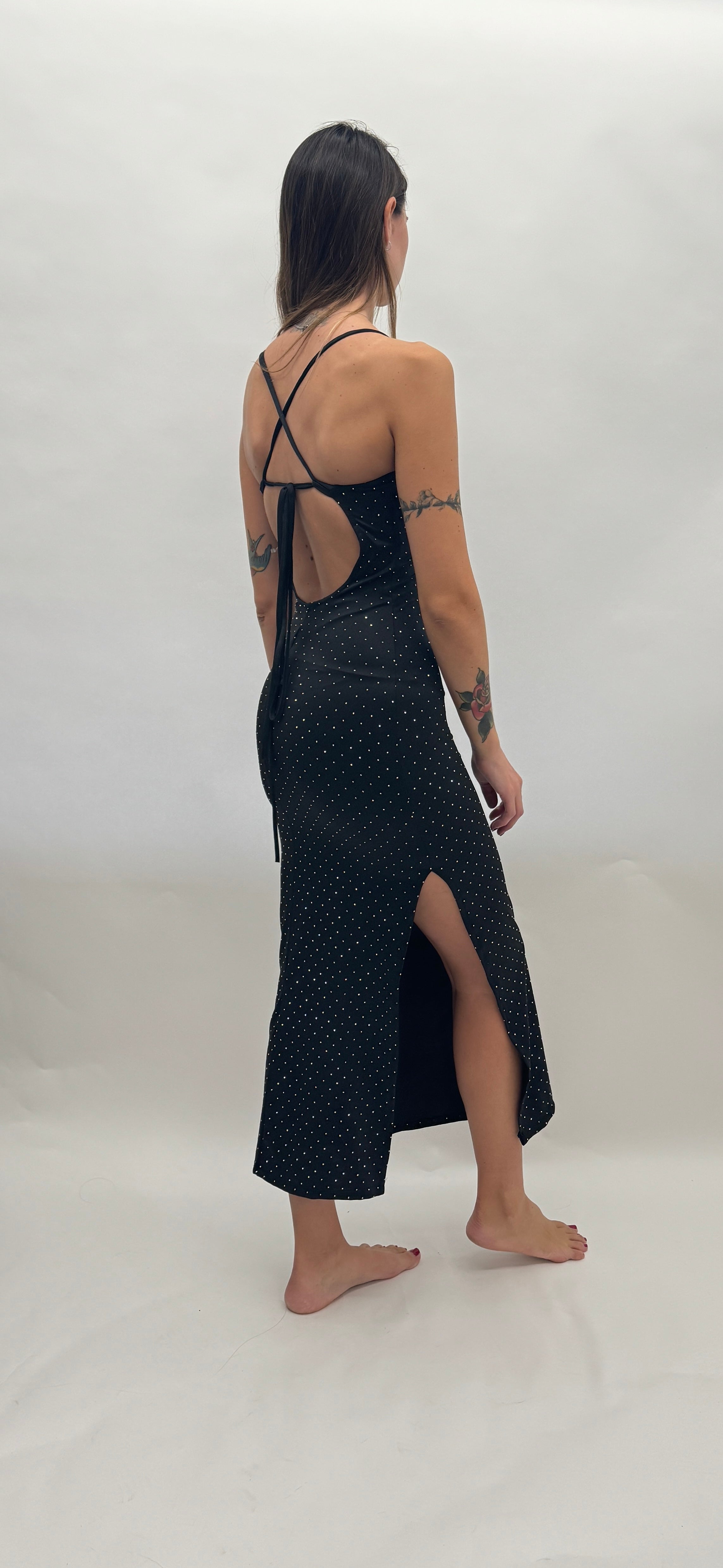 Abito midi a fascia con spacco nel lato destro e spalline sottili incrociate e regolabili con allacciatura posteriore. Tutto l'abito è ricoperto da piccole borchiette luminose